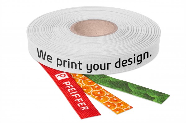 Freie Wahl der Rapportlänge, beliebige Anzahl von Farben, absolut abriebfester Druck, ÖKOTEX 100 zertifiziert. Der Druck erfolgt auf besonders glattem Polyester oder auf recycelten Bändern.